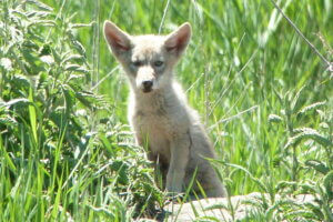 After breeding in February, females give birth in April. While litter size is typically four to seven pups, coyotes are able to adjust their litter sizes based on food abundance and population density. After several weeks in the den, pups venture out so that by the end of summer, they may start exploring—and even hunting—on their own or with siblings.